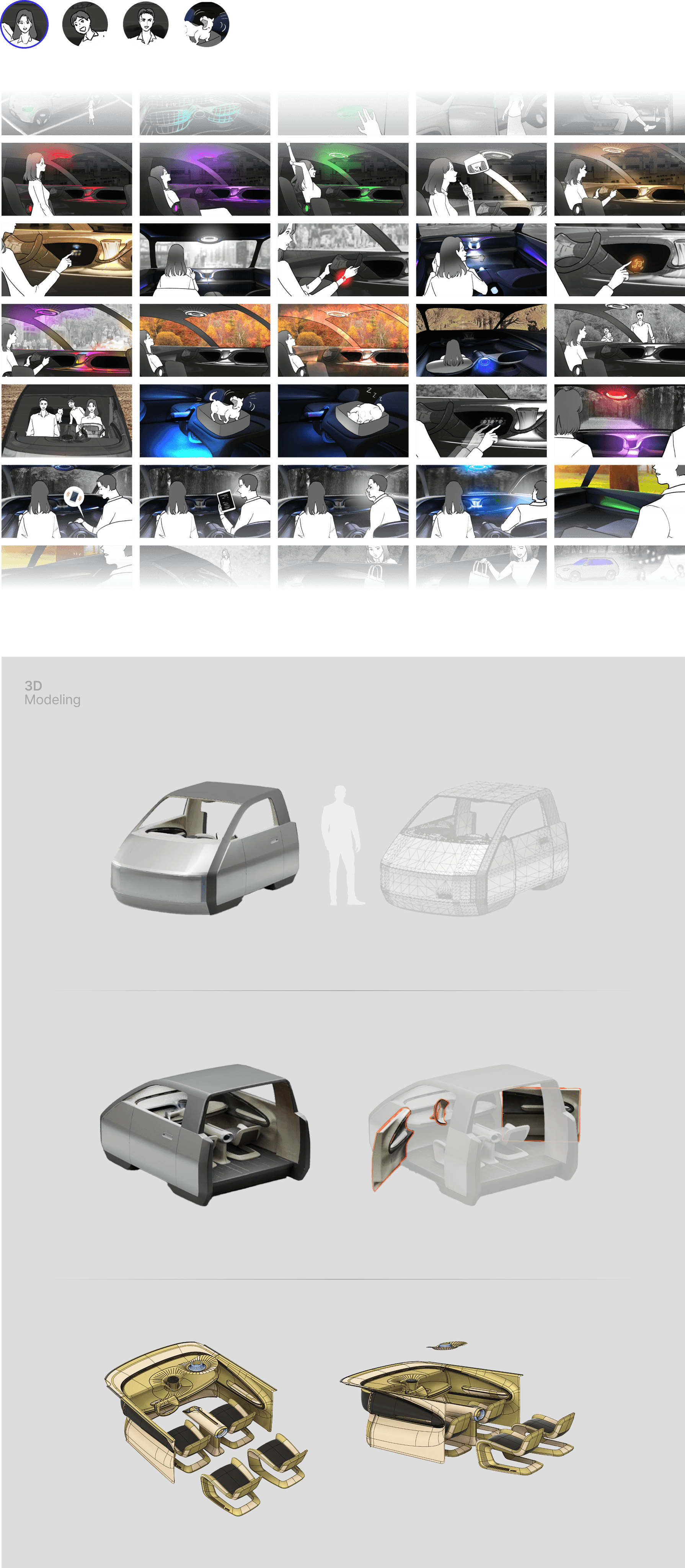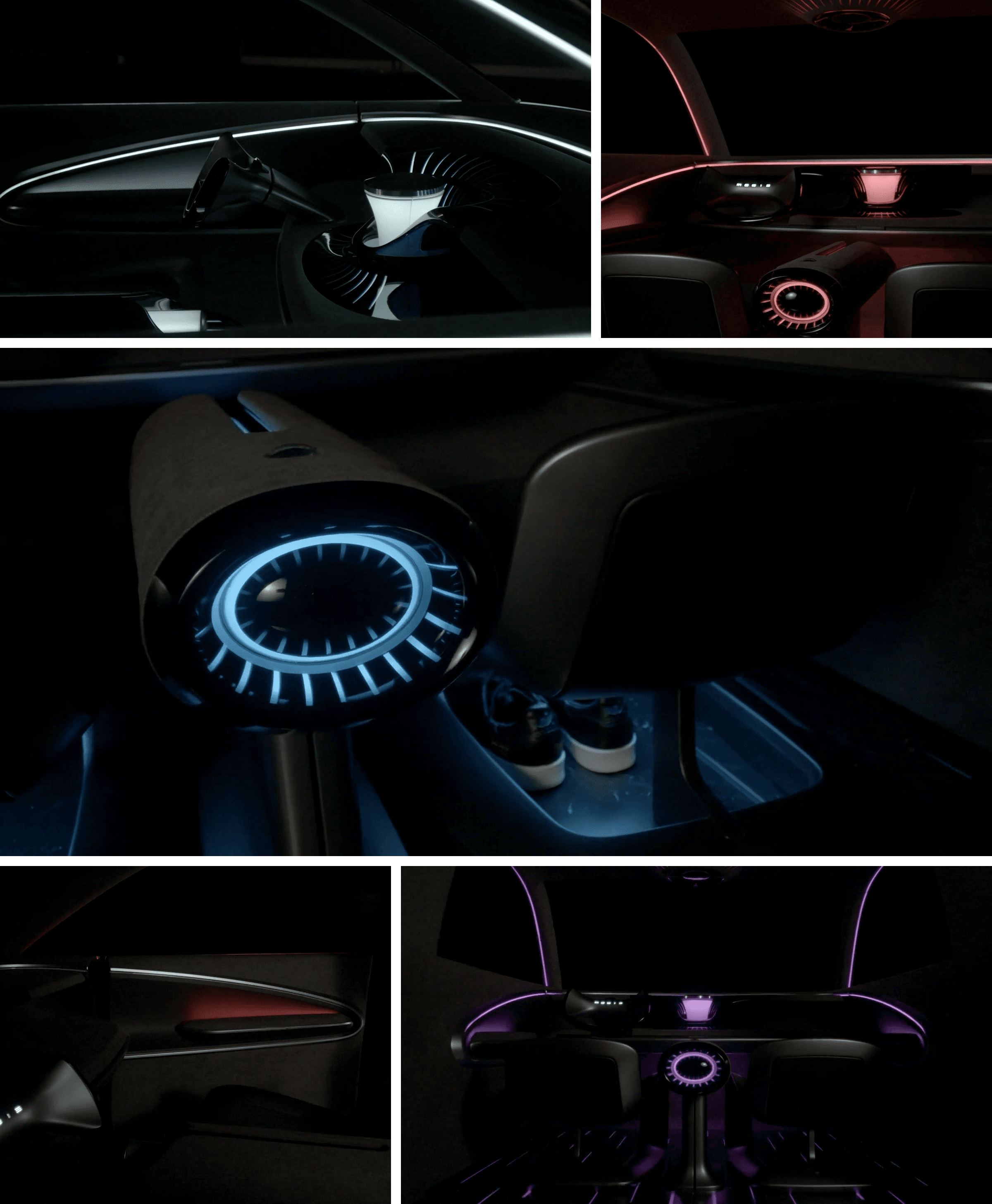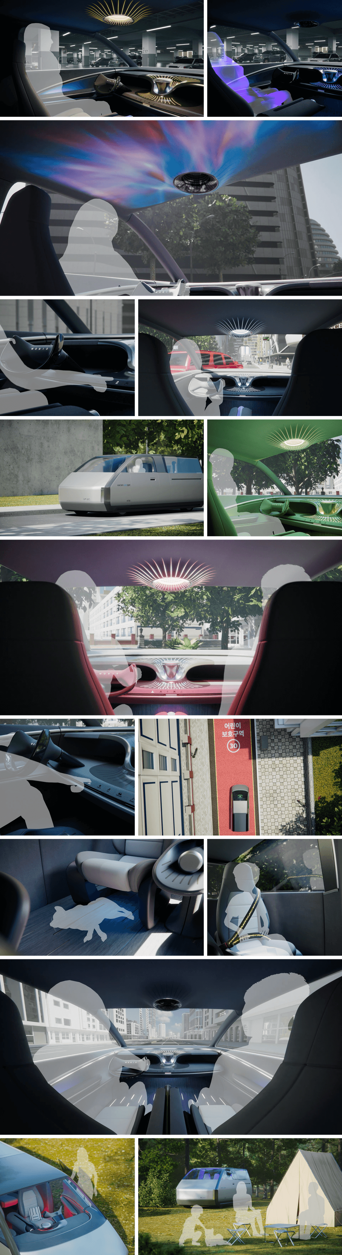 Following the driving story of a family based on the persona of a woman in her mid-30s, visitors encounter various interior lighting concepts developed by Hyundai Mobis. Throughout different driving contexts, passengers interact with human-centric interior lighting that responds to their emotions and behaviors.
