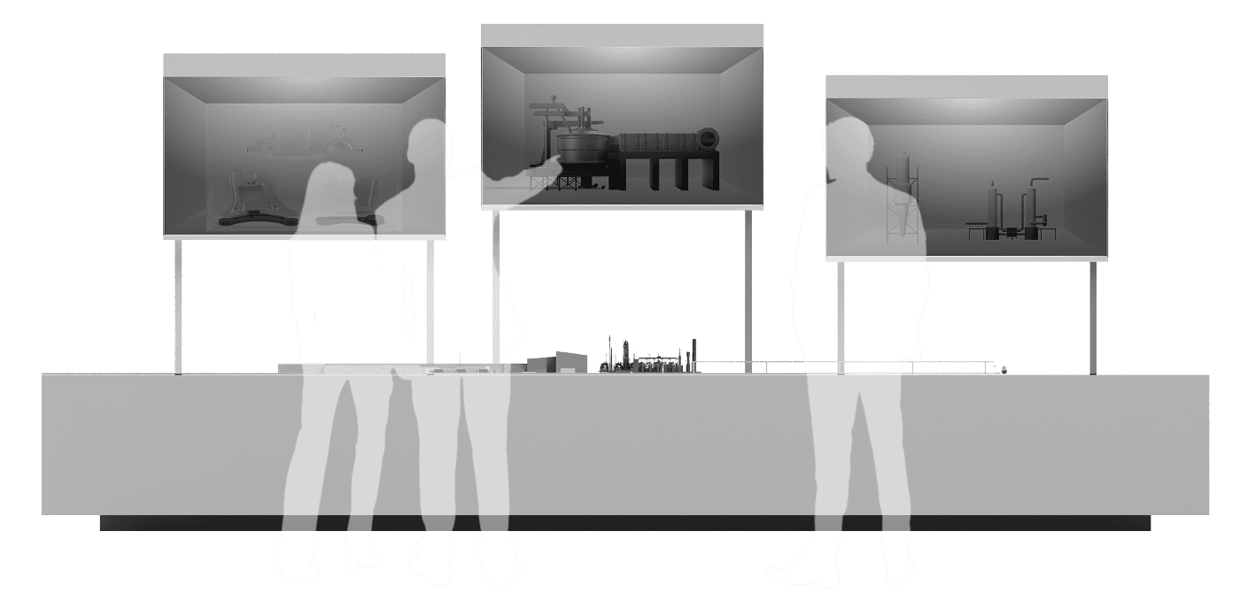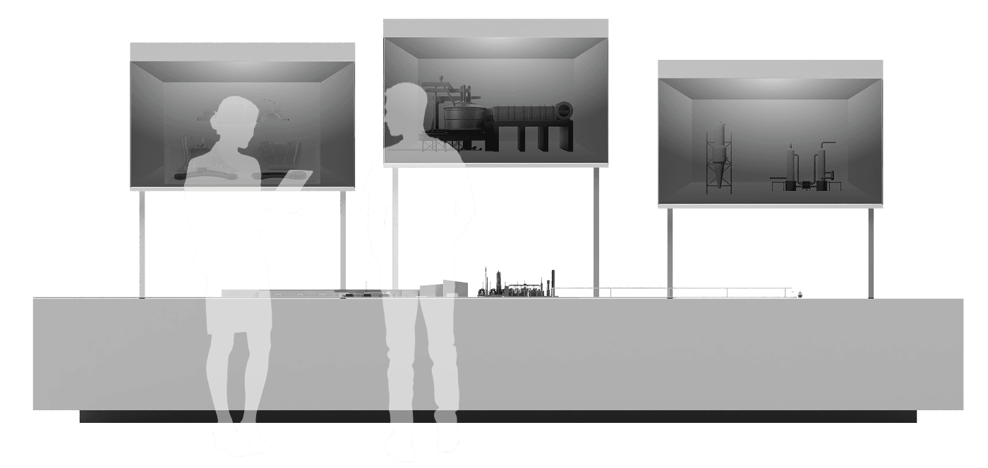 The integration of TOLED and internal dioramas enables an intuitive presentation for explaining the facilities. By organizing equipment into functional groups within a segmented spatial layout and synchronizing them with corresponding split screens, we have ensured that information is delivered intuitively to visitors.