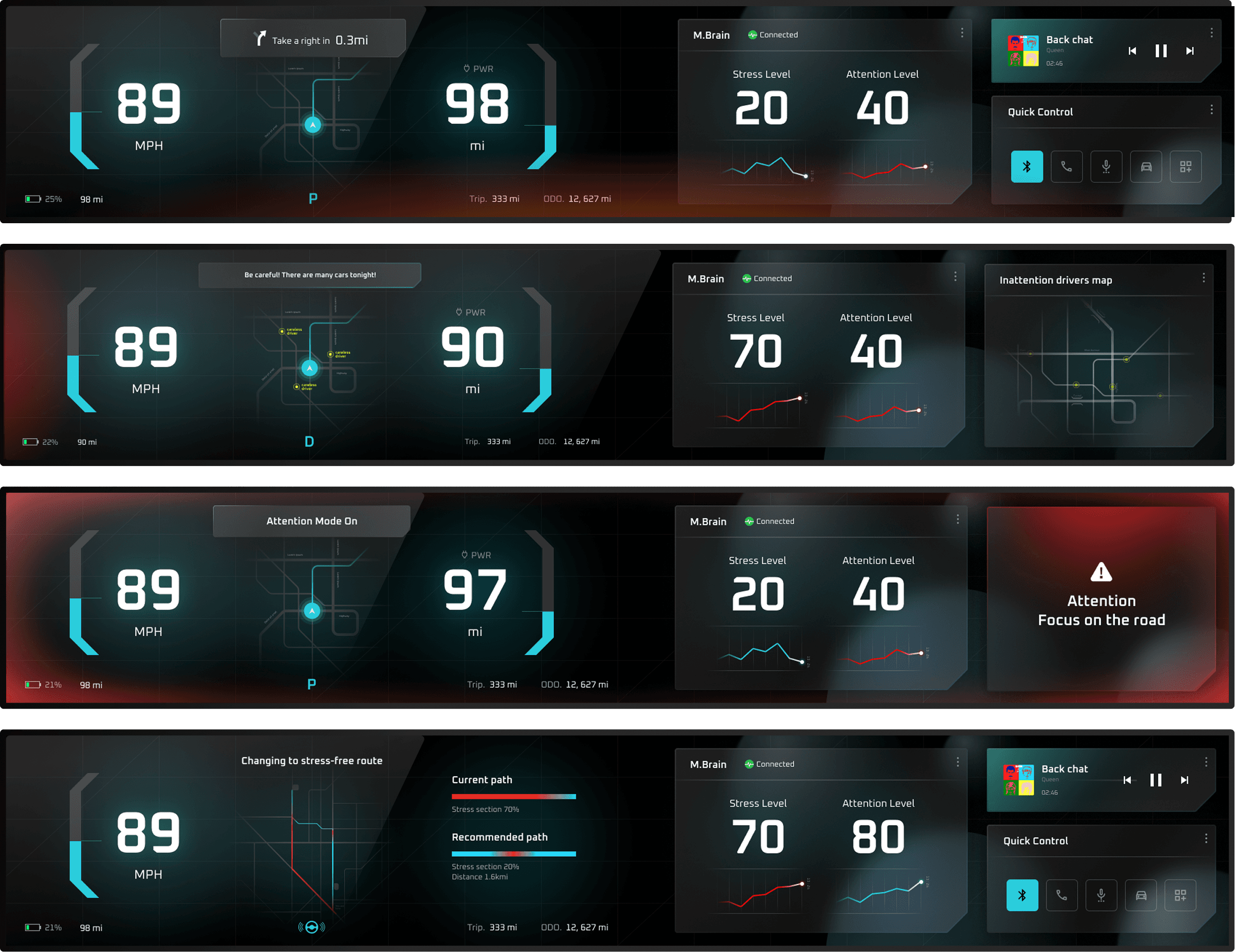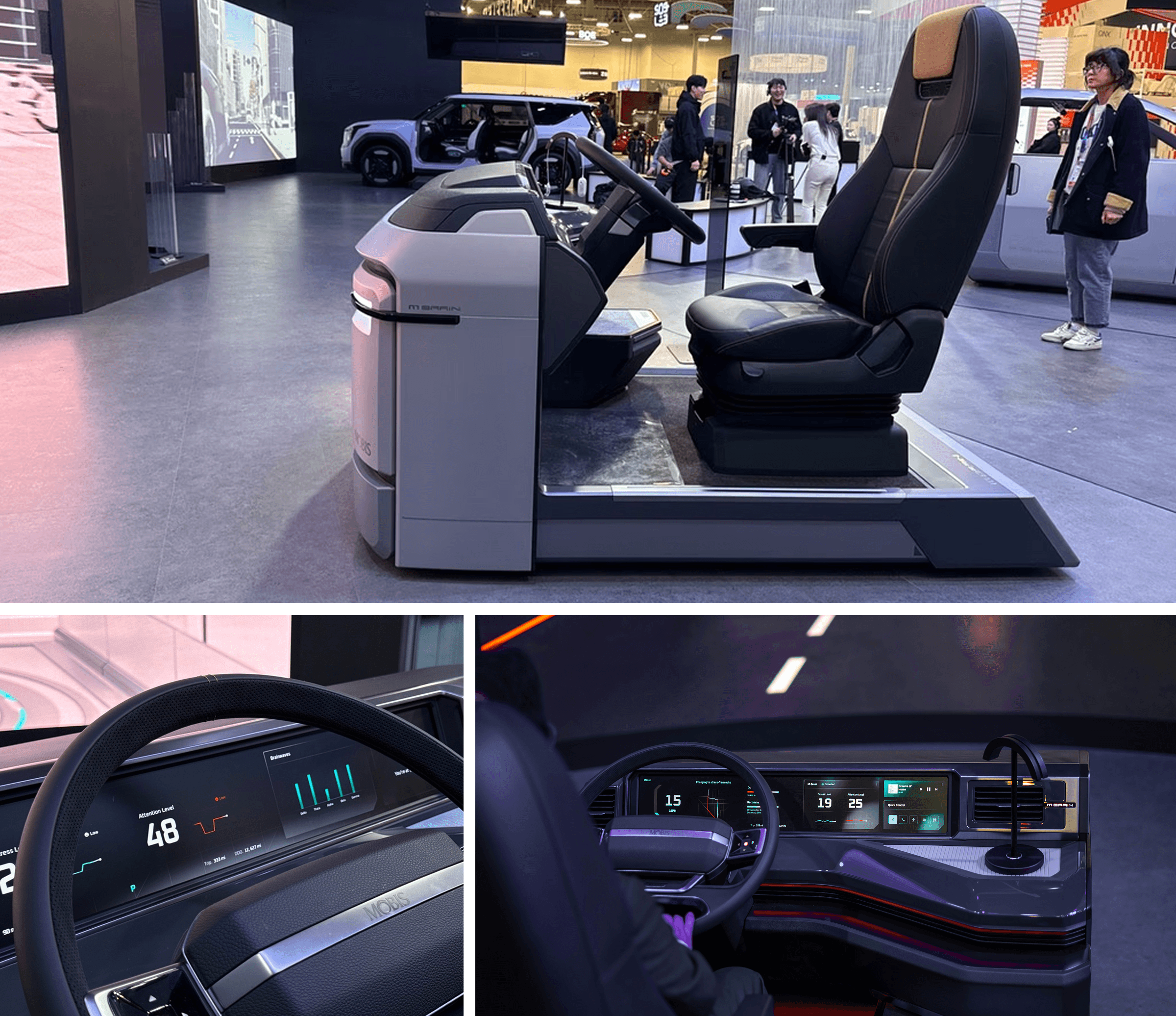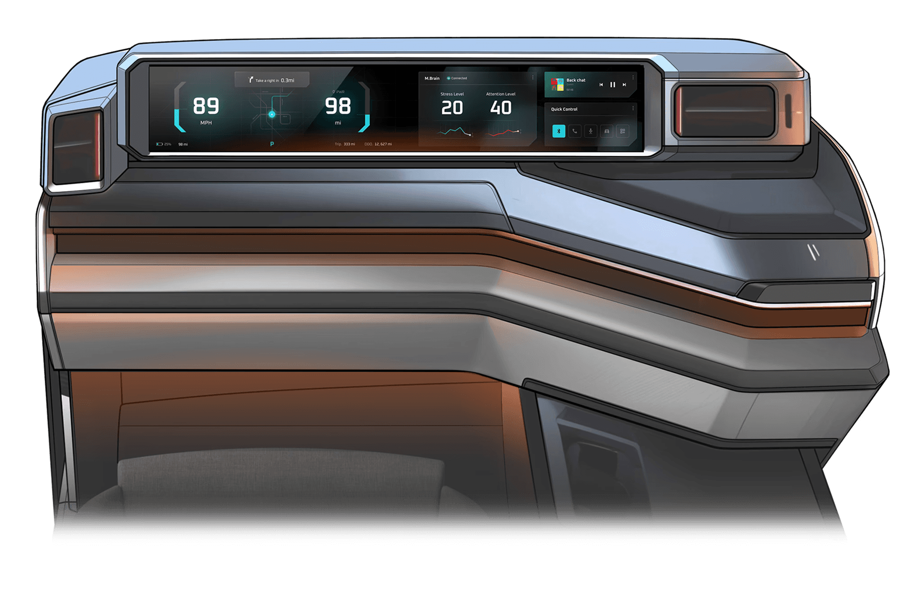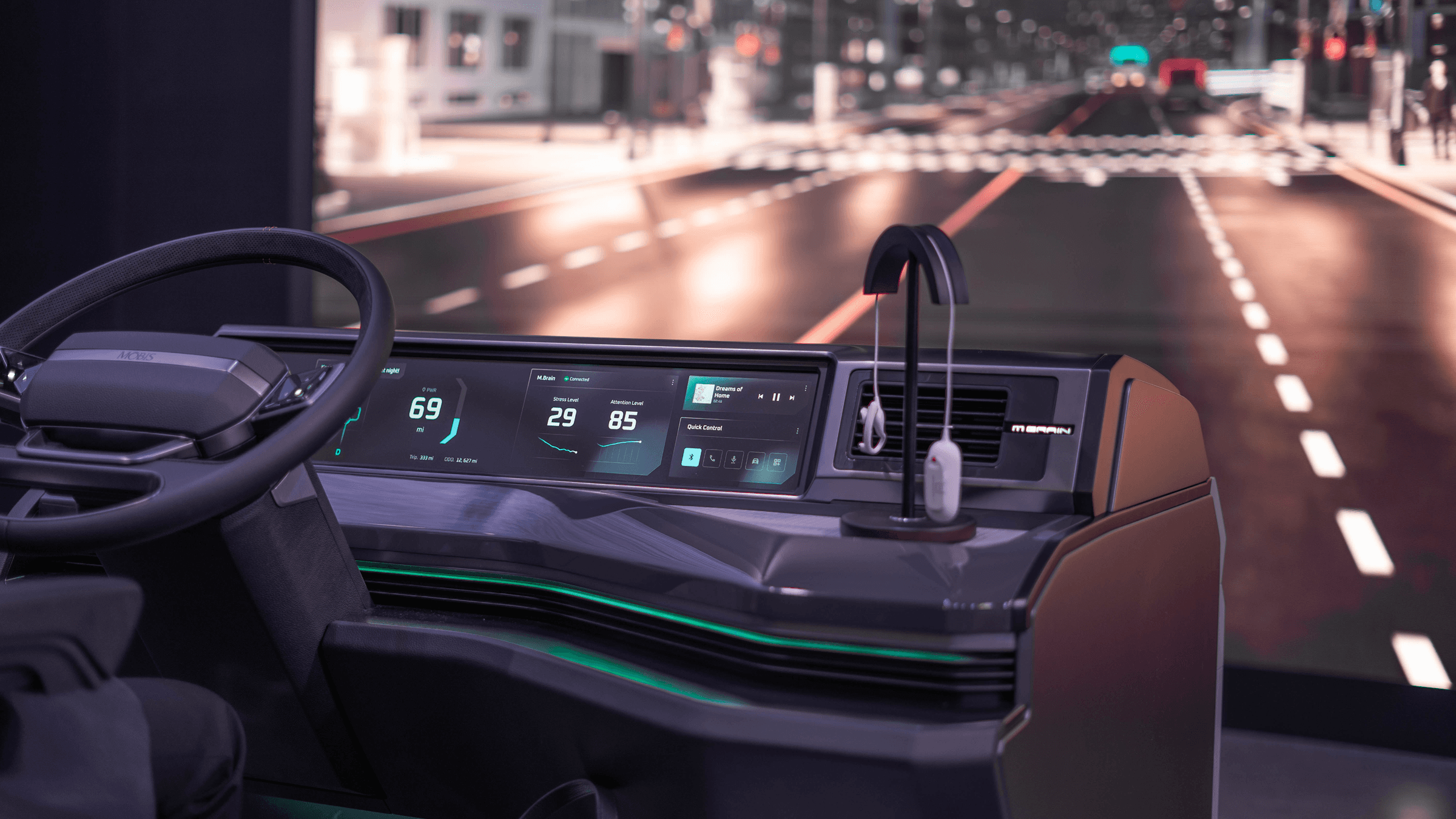 Visitors boarding the mobility mock-up experience the concept and potential of M.Brain through an interactive driving scenario. Their brainwaves are measured in real time, generating a personalized driving environment optimized to their mental state. As the simulation unfolds, the system dynamically adjusts the driving conditions based on the driver’s changing brainwave patterns, offering a fully adaptive and immersive experience.