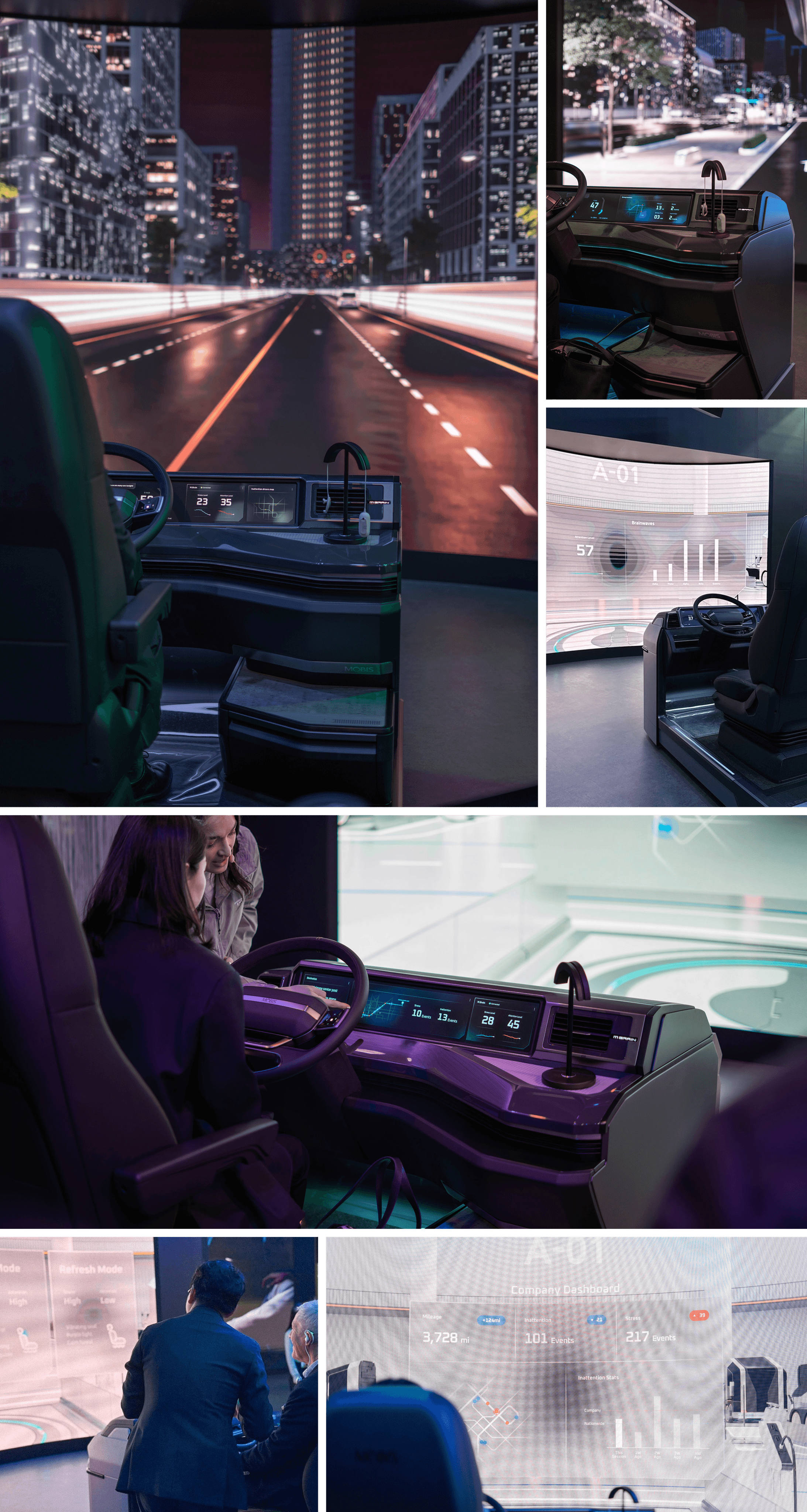 M.Brain 체험을 위한 목업은 상업용 모빌리티를 콘셉트로 디자인되었습니다. 어보드는 상업용 트럭의 1/4 스케일 시팅 벅(Seating Buck)과 시나리오에 연동되는 전장 시스템 모듈을 설계 및 제작하였습니다. 내·외장 조명과 전장 시스템은 M.Brain 센서 및 체험 시나리오와 긴밀히 연동되어, 관람객에게 몰입감 있고 풍부한 체험을 제공합니다.