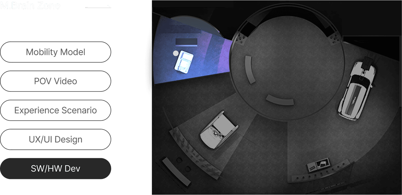 모빌리티 목업에 탑승한 관람객들은 주행 시나리오를 통해 M.Brain의 개념과 가능성을 직관적으로 체험할 수 있습니다. 탑승자는 실제 자신의 뇌파를 측정하고, 각자의 뇌파 상태에 따라 최적화된 주행 환경을 제공합니다. 주행이 진행됨에 따라 변화하는 운전자의 뇌파에 맞춰 다양한 주행 환경이 실시간으로 구현됩니다.
