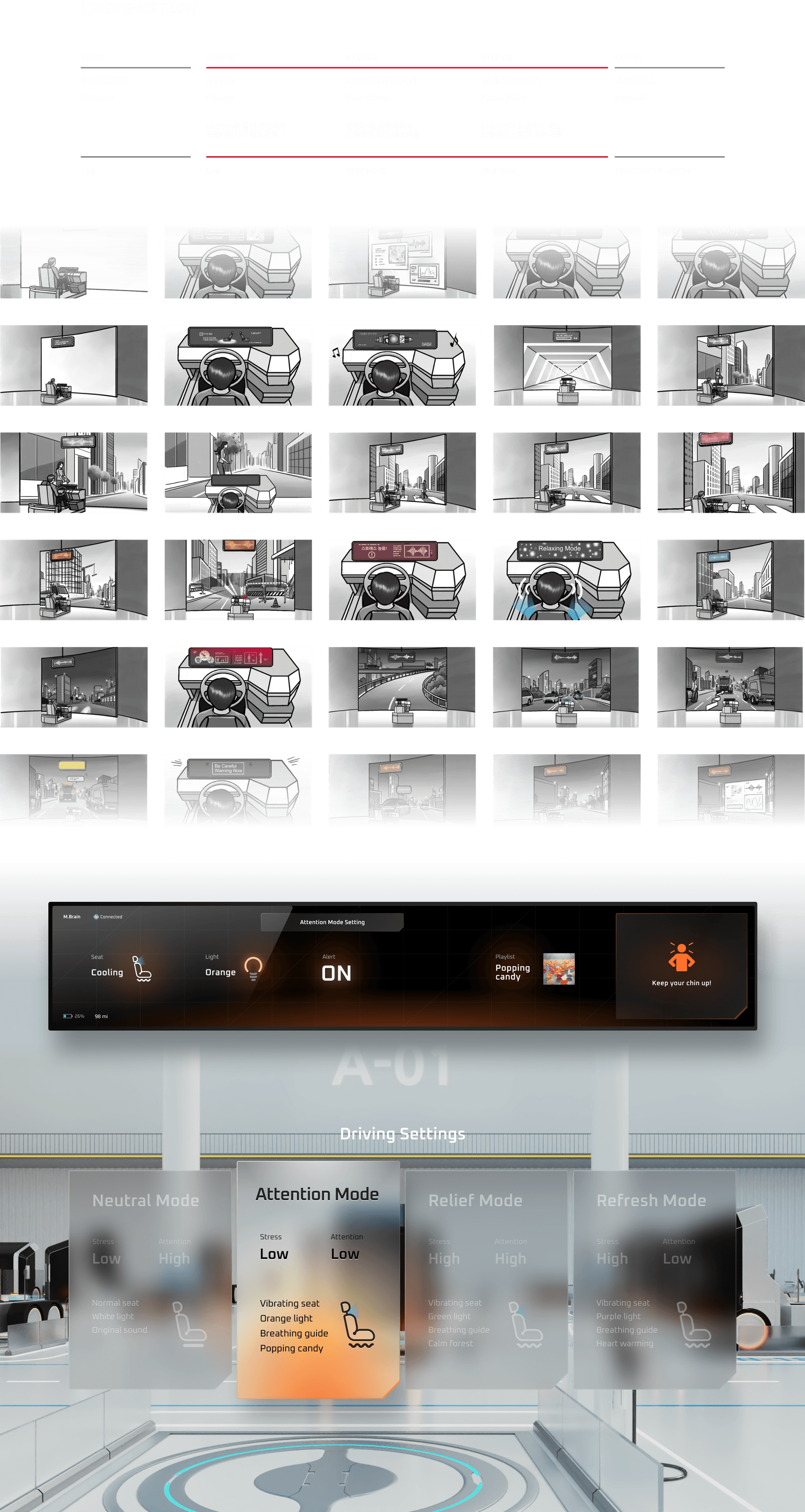 주행 중 돌발 위험 상황, 고도의 집중이 필요한 구간, 스트레스 완화나 졸음 방지 등 다양한 주행 맥락에서 M.Brain이 운전자에게 제공할 수 있는 서비스를 체험할 수 있도록 특별한 시나리오를 구성하였습니다. M.Brain의 센싱 데이터를 기반으로 클러스터, AVN, 조명, 진동, 사운드, 공조 시스템 등이 유기적으로 작동하며, 운전자에게 최적화된 주행 환경을 제공합니다.