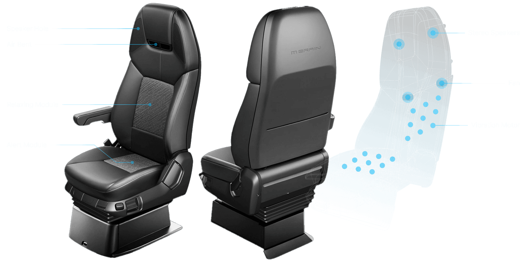 시트에는 시나리오에 기반한 다양한 전장 시스템이 내장되어 있습니다. 스테레오 스피커는 방향성 있는 사운드를 통해 운전자의 주의를 유도하며, 헤드레스트의 에어벤트에서는 시원한 바람이 나와 운전자의 집중을 환기시킵니다. 등받이에 내장된 진동 모터는 부드러운 모션으로 운전자의 스트레스를 완화하고, 좌석 하부의 진동 모터는 강한 진동으로 위험 상황을 알리거나 경고를 전달합니다.